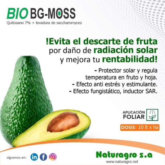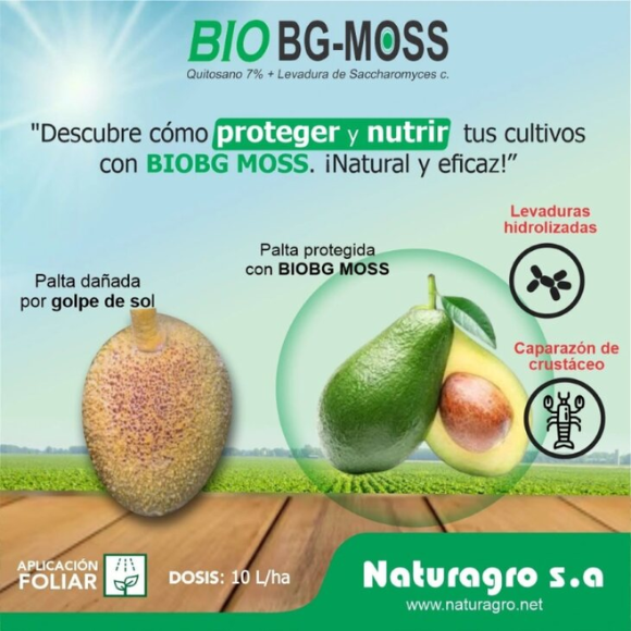 BIO BG-MOSS es una mezcla homogénea con alto contenido de quitosano (Poly-D-glucosamina) extraído de caparazones de crustáceos y levaduras hidrolizadas de Saccharomyces cerevisiae. Aporta oligosacáridos (mananos y glucanos), aminoácidos y vitaminas, siendo un producto de origen natural adecuado para programas de manejo nutricional y fisiológico de los cultivos.