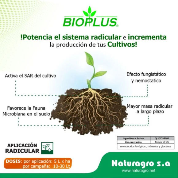 BIOPLUS es un activador radicular cuyo ingrediente activo es quitosano, un polisacárido de origen natural obtenido a partir de caparazones de crustáceos. Su aplicación estimula las defensas naturales de la planta y favorece el desarrollo del sistema radicular. Contribuye a mejorar la salud de la rizósfera y el vigor del cultivo dentro de programas de manejo agrícola