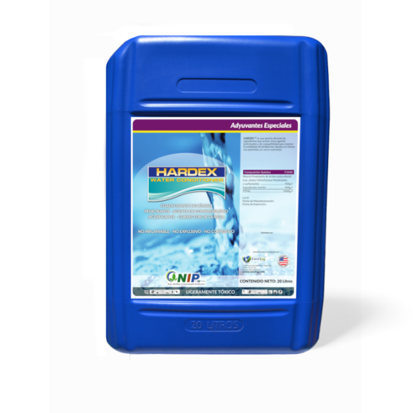 HARDEX™ es un acondicionador de agua formulado con agentes bufferizantes y de compatibilidad que mejoran la estabilidad de fertilizantes líquidos en mezcla con pesticidas y micronutrientes. Actúa quelatando iones presentes en aguas duras y regulando el pH, favoreciendo la eficacia de las aspersiones y la compatibilidad de mezclas de tanque con uno o más agroquímicos