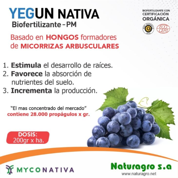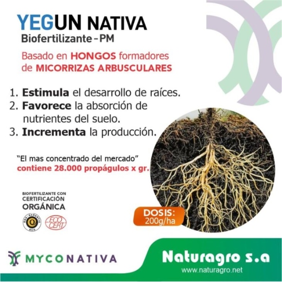 Yegun® Nativa es un biofertilizante formulado a base de hongos micorrícicos arbusculares nativos, aislados de la región de La Araucanía (Chile). Está diseñado como vigorizador de plantas agrícolas y puede aplicarse junto con el agua de riego. Estos hongos establecen una simbiosis con las raíces, favoreciendo la absorción de agua y nutrientes esenciales.