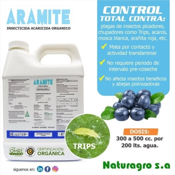 ARAMITE® es un insecticida vegetal formulado a base de aceite de clavo de olor, certificado OMRI. Actúa por contacto y con efecto translaminar, ayudando al control de insectos en diversos cultivos. No requiere período de reingreso y se caracteriza por su bajo impacto sobre insectos benéficos y abejas, siendo una alternativa compatible con programas de manejo integrado