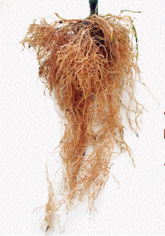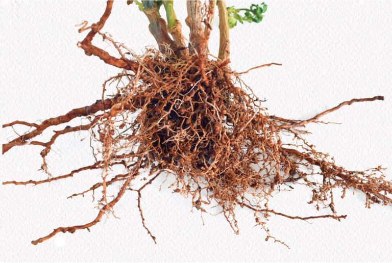 Formación de agallas en las raíces que limitan el flujo de agua y nutrientes hacia el follaje.