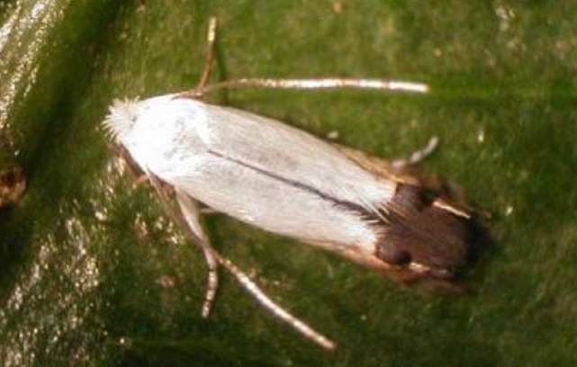 El estadío adulto de este insecto es una mariposa pequeña, mide aproximadamente 3 mm de largo y es de color gris con una mancha más oscura en la punta del ala anterior. Durante el día se mantiene inactivo en el envés de las hojas. La oviposición (postura de huevos) se da en el haz de las hojas durante la noche. La larva penetra la piel de las hojas y consume la parte interna, observándose la galerías en la parte superior de la hoja (haz). Los huevos son casi microscópicos, redondos, aplanados y son puestos en el haz de la hoja. La hembra adulta (mariposa) en un período de 15 días puede poner 75 huevos.
