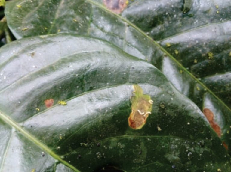 Las larvas minan las hojas del cafeto. Pueden causar fuertes defoliaciones, tanto en cafetales con sombra o expuestos al sol, se presenta con mayor intensidad en época seca.